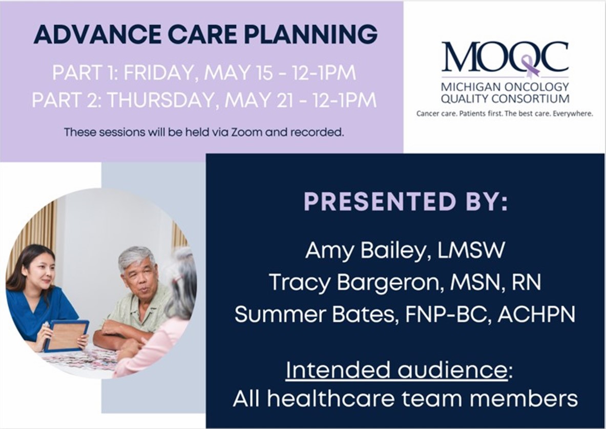 Interdisciplinary oncology team members are invited to participate in a two‑session educational series focused on Advance Care Planning (ACP). The series will provide an overview of key ACP concepts in cancer care, including integration with Goals of Care conversations and the appropriate use of Out‑of‑Hospital Do Not Resuscitate (DNR) orders and the Michigan Physician Orders for Scope of Treatment (MI‑POST) form. This education is designed to support coordinated, patient‑centered communication and documentation across roles.