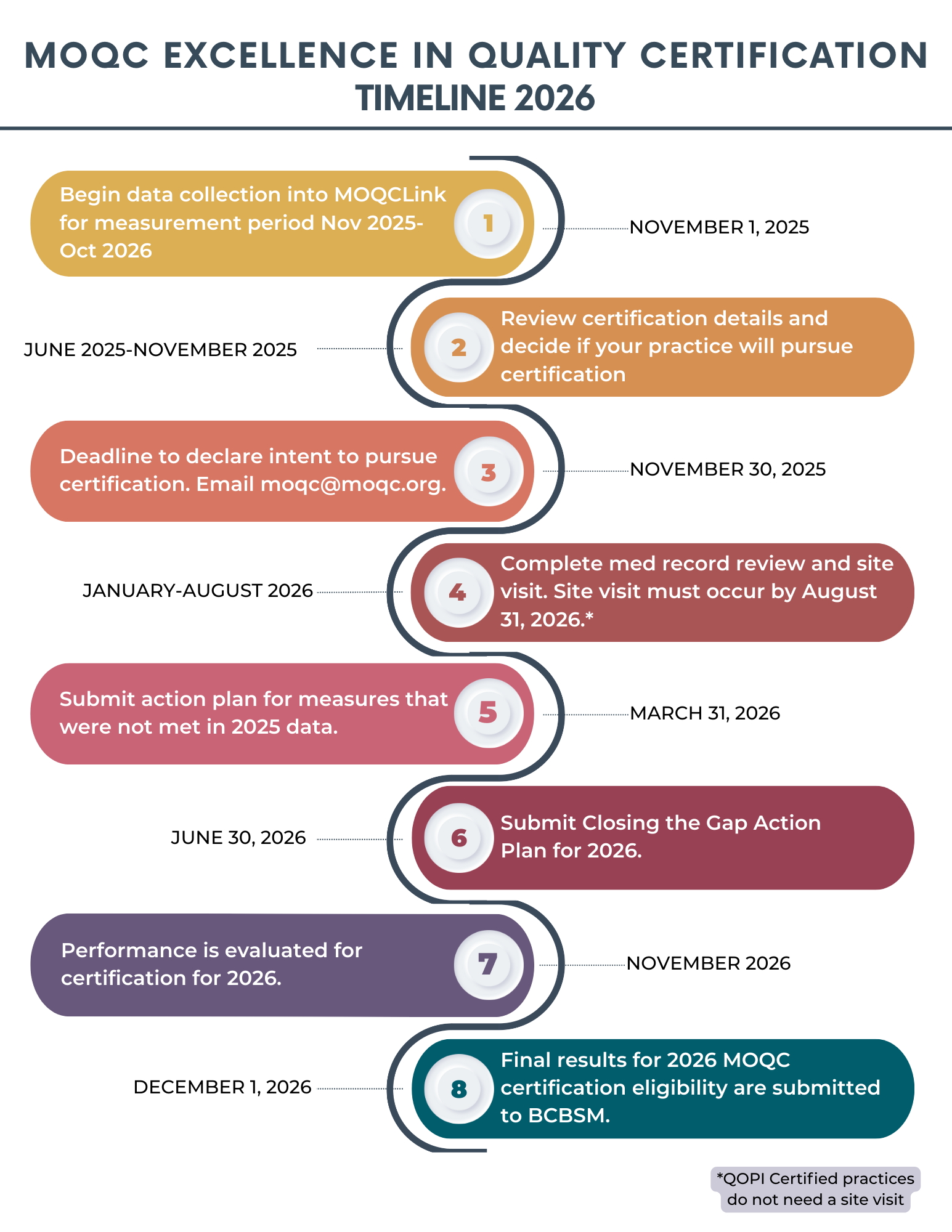 The MOQC certification process will address gaps in quality of care. MOQC certification is available to all MOQC practices regardless of size or resources. In addition, MOQC certification will require efforts to address non-medical needs and gaps in access and quality of care through the creation of a Closing the Gap Action Plan.