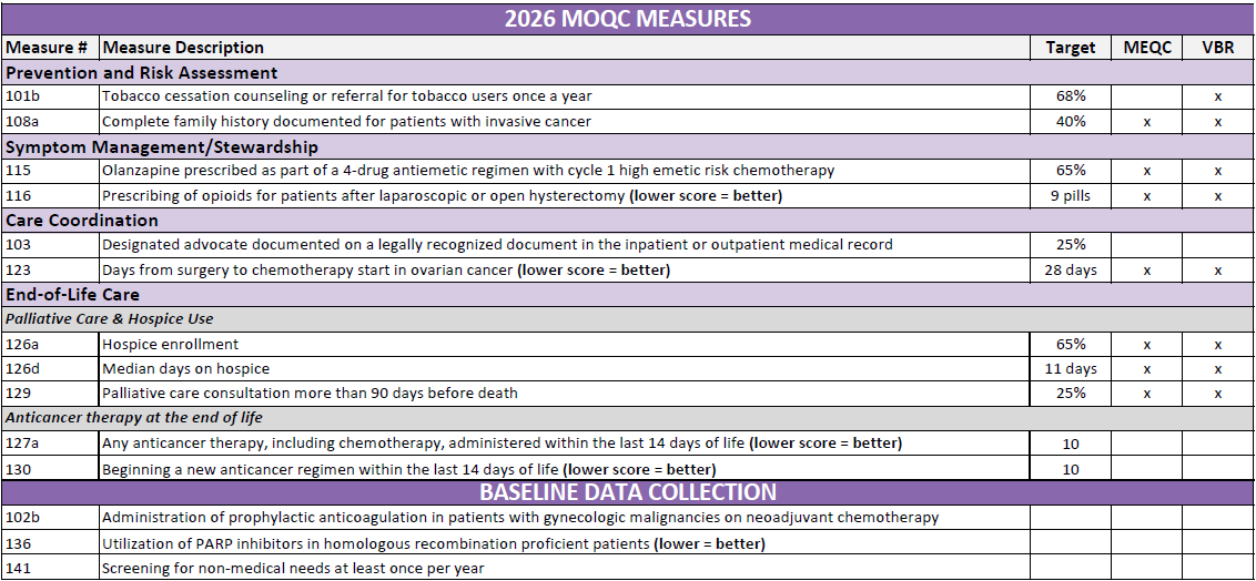 MOQC Measures *For more information on Value-based Reimbursement, click here. +For more information on MOQC Excellence in Quality Certification, click here. For Videos that provide additional details on each measure, click on the links below: Measure Education Videos:Module 1 (101b, 115)Module 2 (108a, 126a/b/c, 127, 123, 116)Module 3 (129, 103, 130) More Materials to Help with Abstraction Other Resources: Family History Guidance for Abstractors (video) Family History Tip Sheet (developed by Sparrow for EPIC)